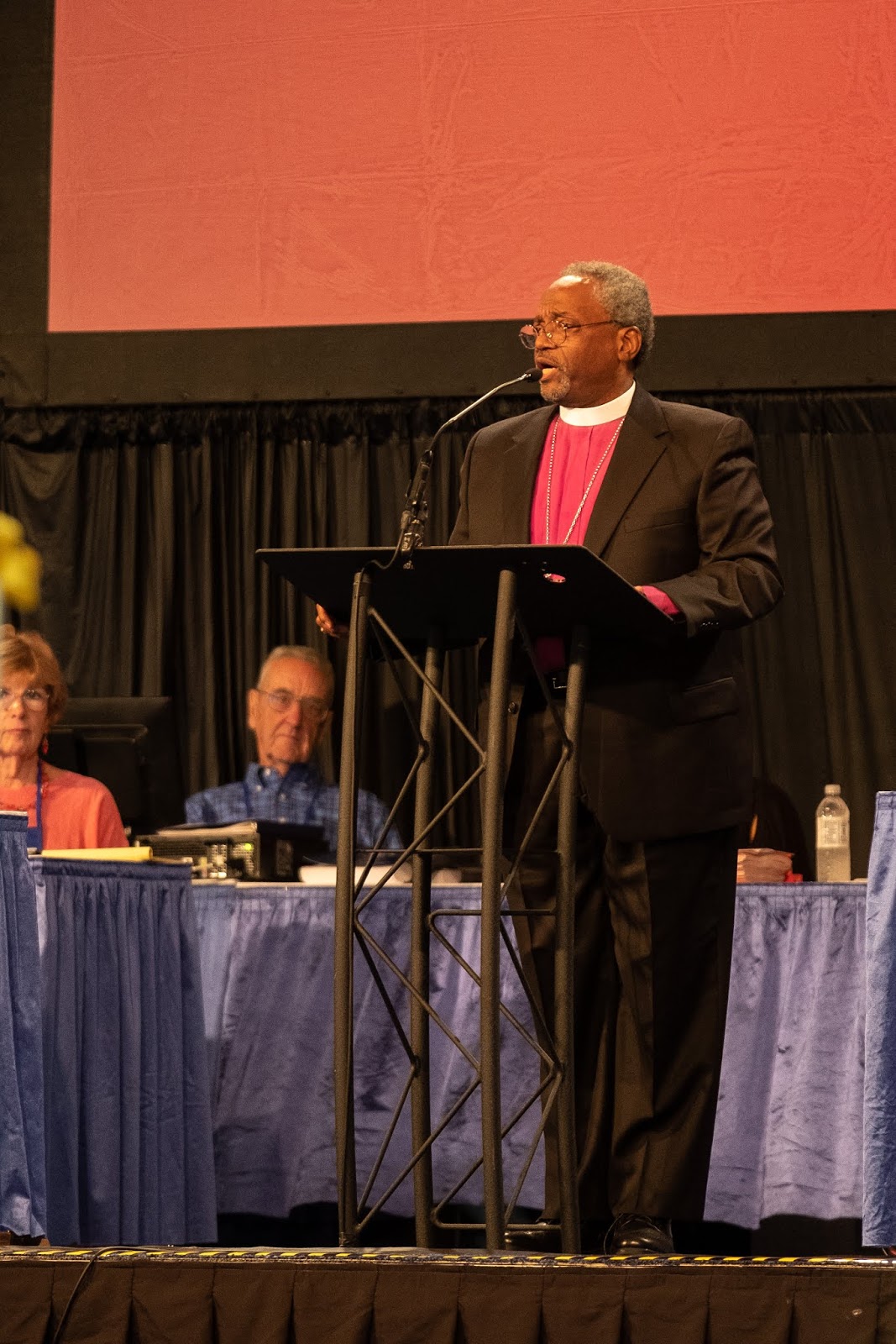 Above Presiding Bishop Michael Curry is shown offering what he said wasn't a sermon. Well, no matter what he called it, he preached up a storm, urging and encouraging us. "We must reclaim a Christianity that actually looks like Jesus of Nazareth," he said.